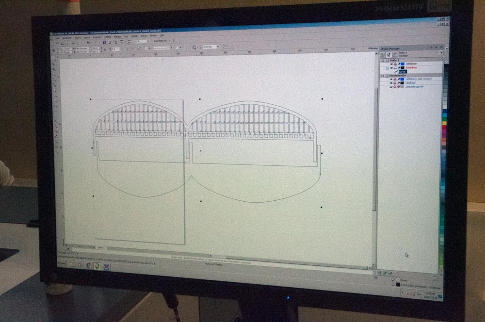 Die Konstruktion dient nur für eine Stellprobe und der Abschätzung der Dimensionen. Die Streben des Hallendachs werden wesentlich feiner ausgeführt. Der Innenraum wird mit LEDs großflächig ausgeleuchtet