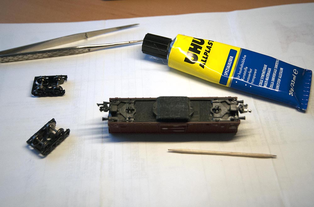 Wenn der Kleber trocken ist werden die Drehgestelle wieder aufgesetzt.