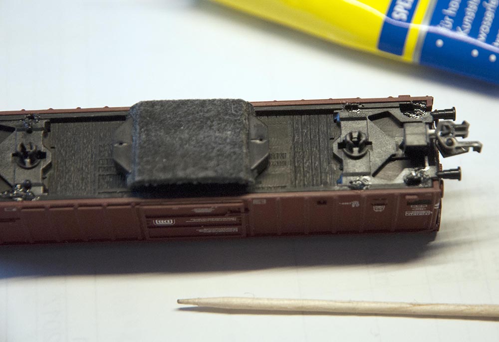 Mit einen Zahnstocher gebe ich einen kleinen Tropfen Kleber in die Vertiefungen am Wagen.